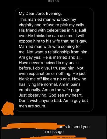 Relationship adviser and blogger, Joro Olumofin has shared the story of this young man who engages in the act of homosexuality. The story has attracted a backlash on social media even though the identity of the man isn’t known.