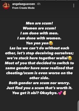 Men are scum! Women are scum! I am done with men. I am done with women. Las las We can’t do without each other, let’s stop deceiving ourselves; we’re stuck here together wallahi Most of you that decided to switch to the same gender have now realized that cheating/scum is even worse on the other side. Yen yen yen. Both genders are scum nor worried. Just find you a scum that’s worth it. You get it abi? Okay Bye.”
