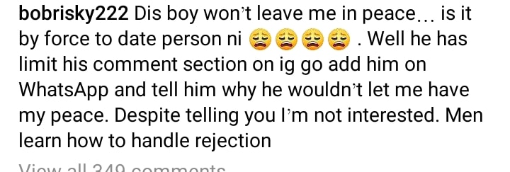 “Dis boy won’t leave me in peace… is it by force to date person ni . Well he has limit his comment section on ig go add him on WhatsApp and tell him why he wouldn’t let me have my peace. Despite telling you I’m not interested. Men learn how to handle rejection”