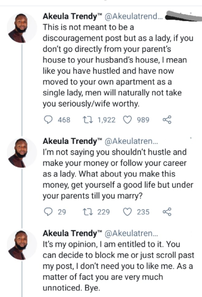 “I’m not saying you shouldn’t hustle and make your money or follow your career as a lady. What about you make this money, get yourself a good life but under your parents till you marry? It’s my opinion, I am entitled to it. You can decide to block me or just scroll past my post, I don’t need you to like me. As a matter of fact you are very much unnoticed. Bye.”
