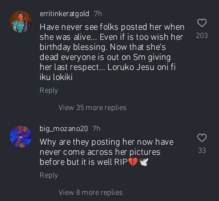 A user, Erri Tinkerat Gold wrote, “Have never seen folks posted her when she was alive. Even if it’s to wish her a birthday blessing, now that she’s dead, everyone is out on social media, giving her last respect. Loruko Jesu oni fi iku lokiki.”