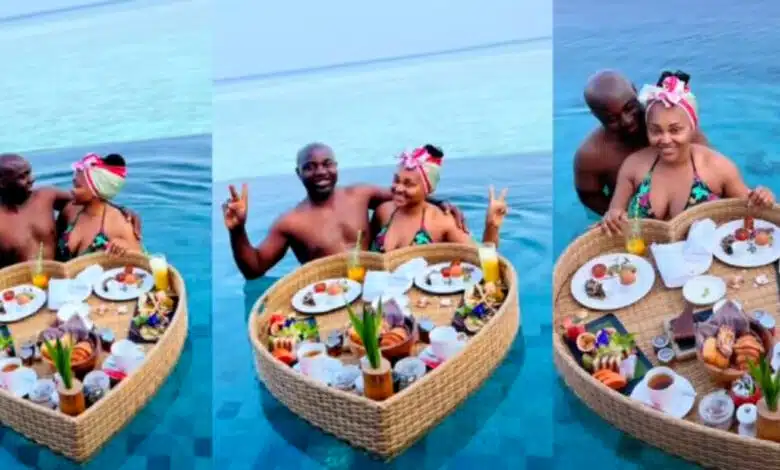 In a new video, Mercy has shared a new video of having breakfast with her husband in a pool. she captioned the post, “Happy Valentines Day Babe @kazimadeoti I love you!”