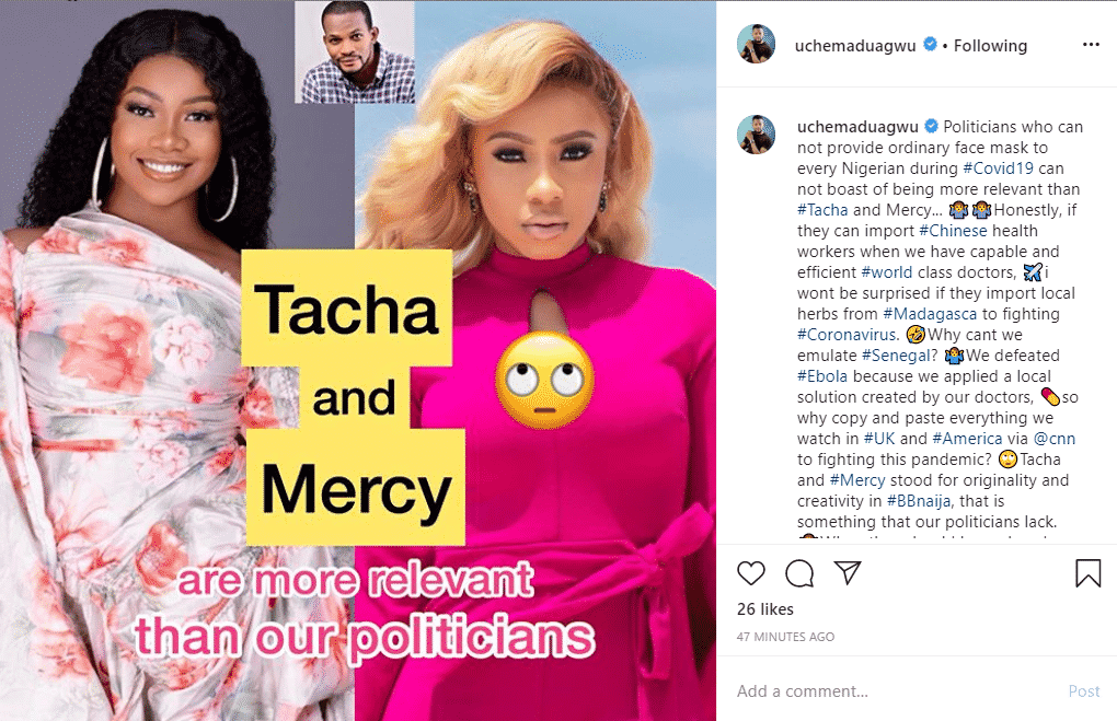 “Politicians who can not provide ordinary face mask to every Nigerian during #Covid19 can not boast of being more relevant than #Tacha and Mercy… ?♀️?♀️Honestly, if they can import #Chinese health workers when we have capable and efficient #world class doctors, ✈️i wont be surprised if they import local herbs from #Madagasca to fighting #Coronavirus. ?Why cant we emulate #Senegal? ?♂️We defeated #Ebola because we applied a local solution created by our doctors, ?so why copy and paste everything we watch in #UK and #America via @cnn to fighting this pandemic? ?Tacha and #Mercy stood for originality and creativity in #BBnaija, that is something that our politicians lack. ?♀️When they should have closed our airports ✈️after seeing the devastating effect of coronavirus in #wuhan and some #EU countries, they were busy playing god when they know our health system is in a state of coma, ?despite all the billions donated, Nigerians in #Lagos, #Abuja and #OgunState were on lockdown for more than a month, but can these politicians boast of giving palliative to more than 300 thousand people? ?Where did all the billions go? ?♂️”