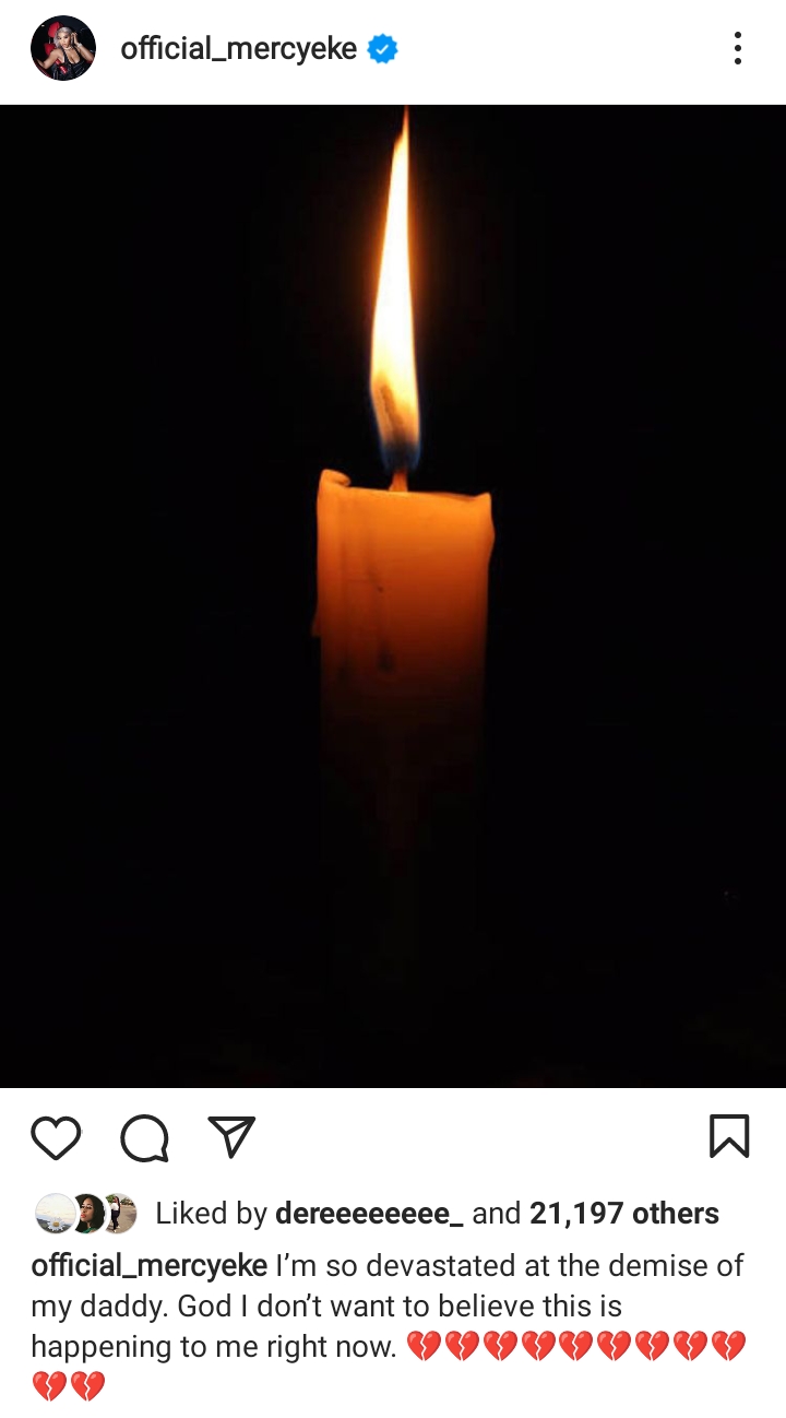 Ex Big Brother Naija housemate, Mercy Eke has lost her father.