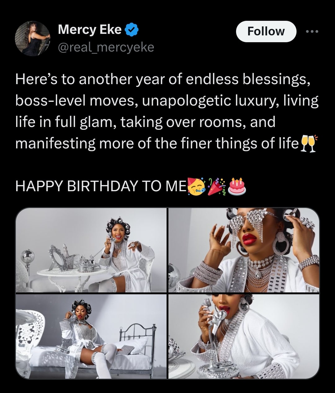 The post was accompanied by stunning photos of Mercy Eke to mark her special day.