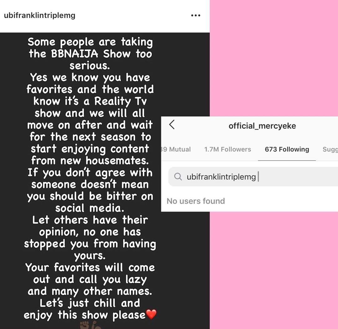 Winner of Big Brother Naija “Pepper Dem” season, Mercy Eke has unfollowed Ubi Franklin after he threw shades at her for calling BBNaija fans lazy people.