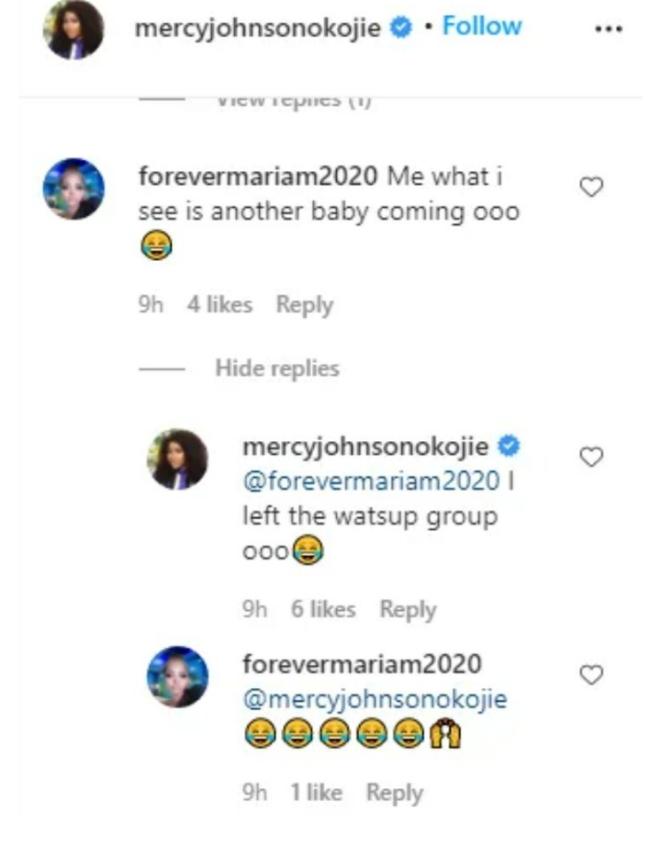 The follower had teased Mercy Johnson about having another baby, but according to the 36 year old mother of four, she has left the WhatsApp group of women who want to have more babies.