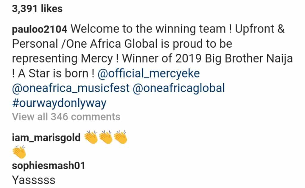 “Welcome to the winning team ! Upfront & Personal /One Africa Global is proud to be representing Mercy ! Winner of 2019 Big Brother Naija ! A Star is born ! @official_mercyeke @oneafrica_musicfest @oneafricaglobal #ourwaydonlyway”