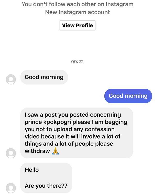 Merit Gold further accused Prince Kpokpogri of pleading to her with a fake account after threatening to release a video confession of the genesis of the drama.