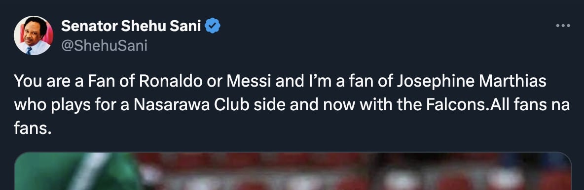 “You are a Fan of Ronaldo or Messi and I’m a fan of Josephine Marthias who plays for a Nasarawa Club side and now with the Falcons. All fans na fans,” he captioned the post.