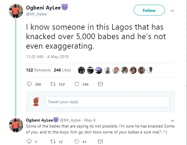 I know someone in this Lagos that has knacked over 5,000 babes and he’s not even exaggerating. Some of the babes that are saying its not possible, I’m sure he has knacked Some of you, and to the boys, him go don blow some of your babes e sure me