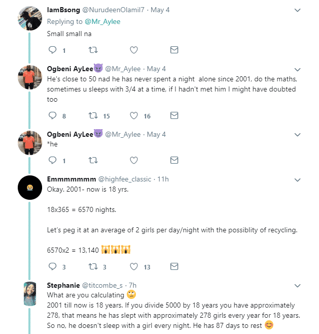 According to @Mr_Aylee, the Lagos who has slept with over 5,000 women is in his 50s and has never spent the night alone since 2001. He tweeted;