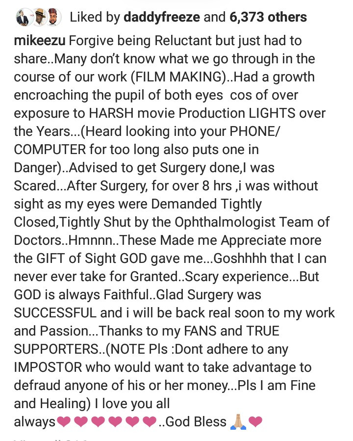 Mike Ezuruonye undergoes eye surgery following abnormal growth on both eyes due to ‘harsh movie production lights’
