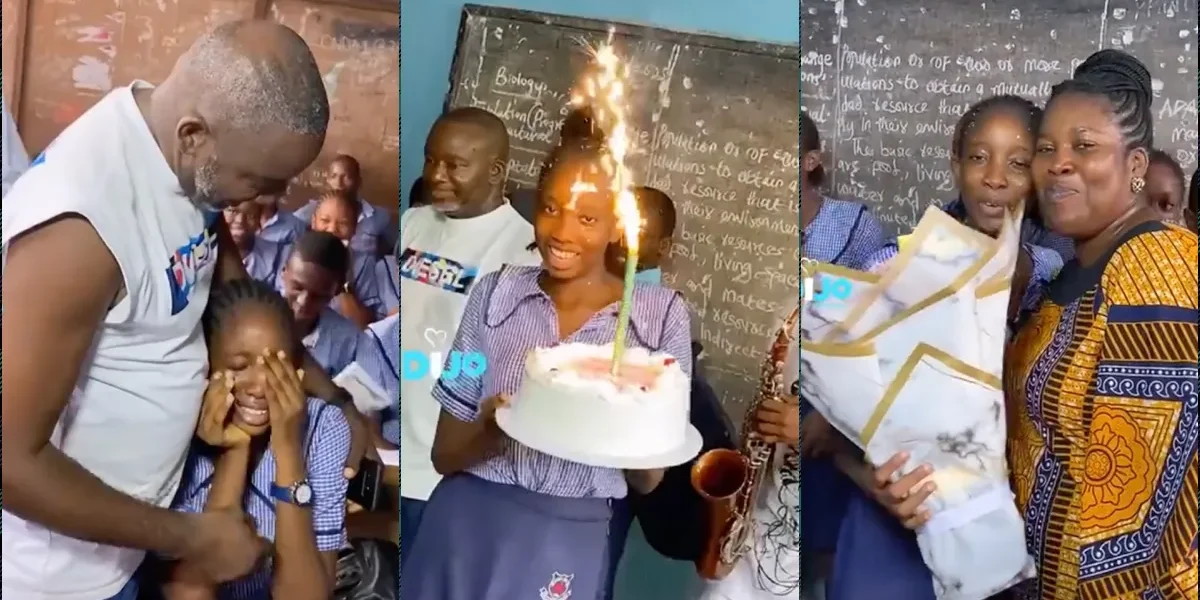 In a viral video circulating on social media, the young girl was moved to tears as her parents arrived unexpectedly with a cake, a money bouquet, a note, and even a trumpeter to mark the occasion.