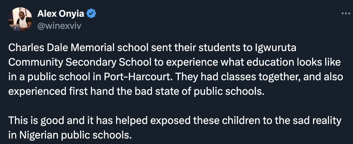 This is good and it has helped exposed these children to the sad reality in Nigerian public schools,” he wrote.