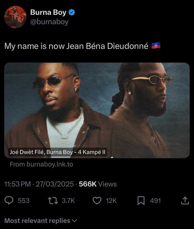 Burna Boy took to his Instagram and X page formerly known as Twitter platforms to reveal his new name — Jean Bena Dieudonne.