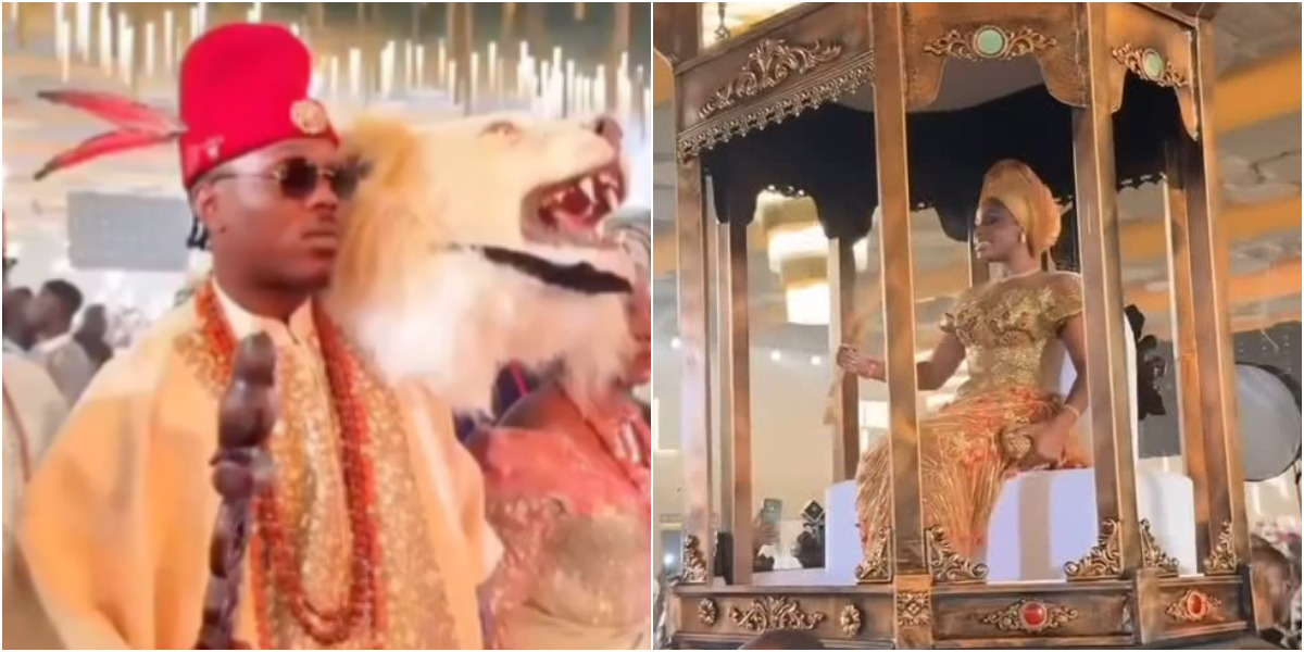 In the video, the groom was seen adorned in his native wear with the head of a lion on his shoulder while walking majestically to the wedding reception.