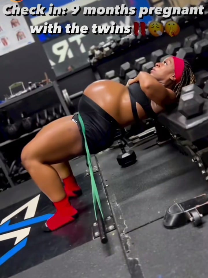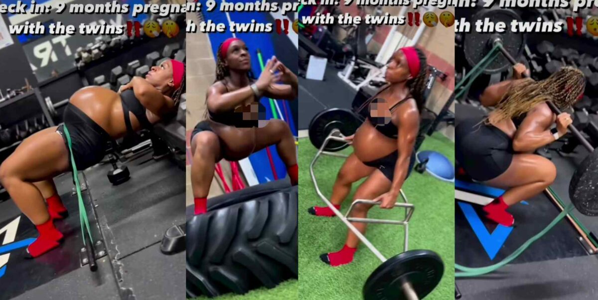 A heavily pregnant woman has sparked a buzz online as she performs different ingense workout routine despite carrying twins.