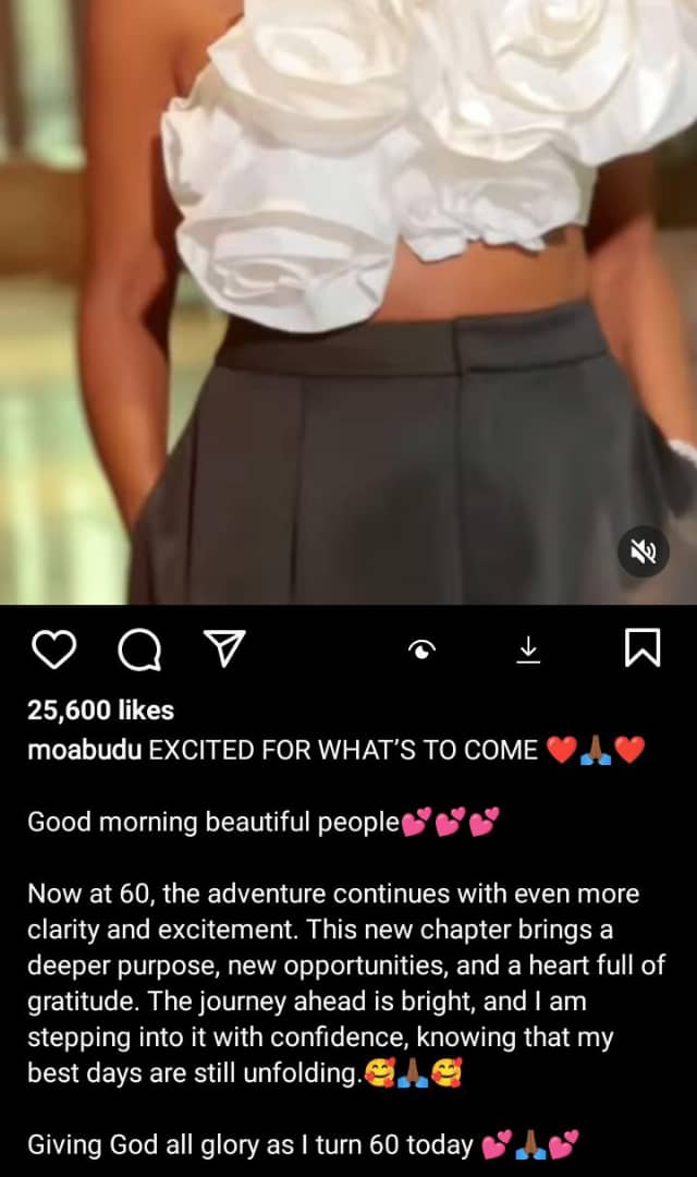 Her words: “EXCITED FOR WHAT’S TO COME ❤️🙏🏾❤️ Good morning beautiful people💕💕💕 Now at 60, the adventure continues with even more clarity and excitement. This new chapter brings a deeper purpose, new opportunities, and a heart full of gratitude. The journey ahead is bright, and I am stepping into it with confidence, knowing that my best days are still unfolding.🥰🙏🏾🥰 Giving God all glory as I turn 60 today 💕🙏🏾💕
