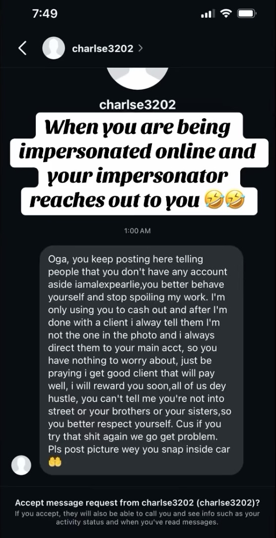 The impersonator, brazenly unapologetic, sent Adekwe a direct message on Instagram, warning him to stop exposing their activities.