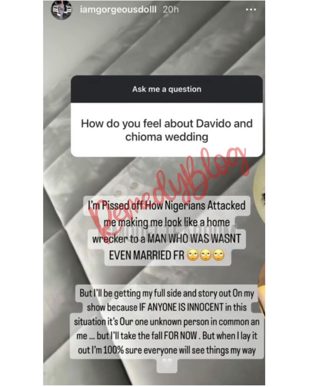 The American model who shared a viral video of Davido begging on his knees in tears has reacted to his wedding to Chioma.