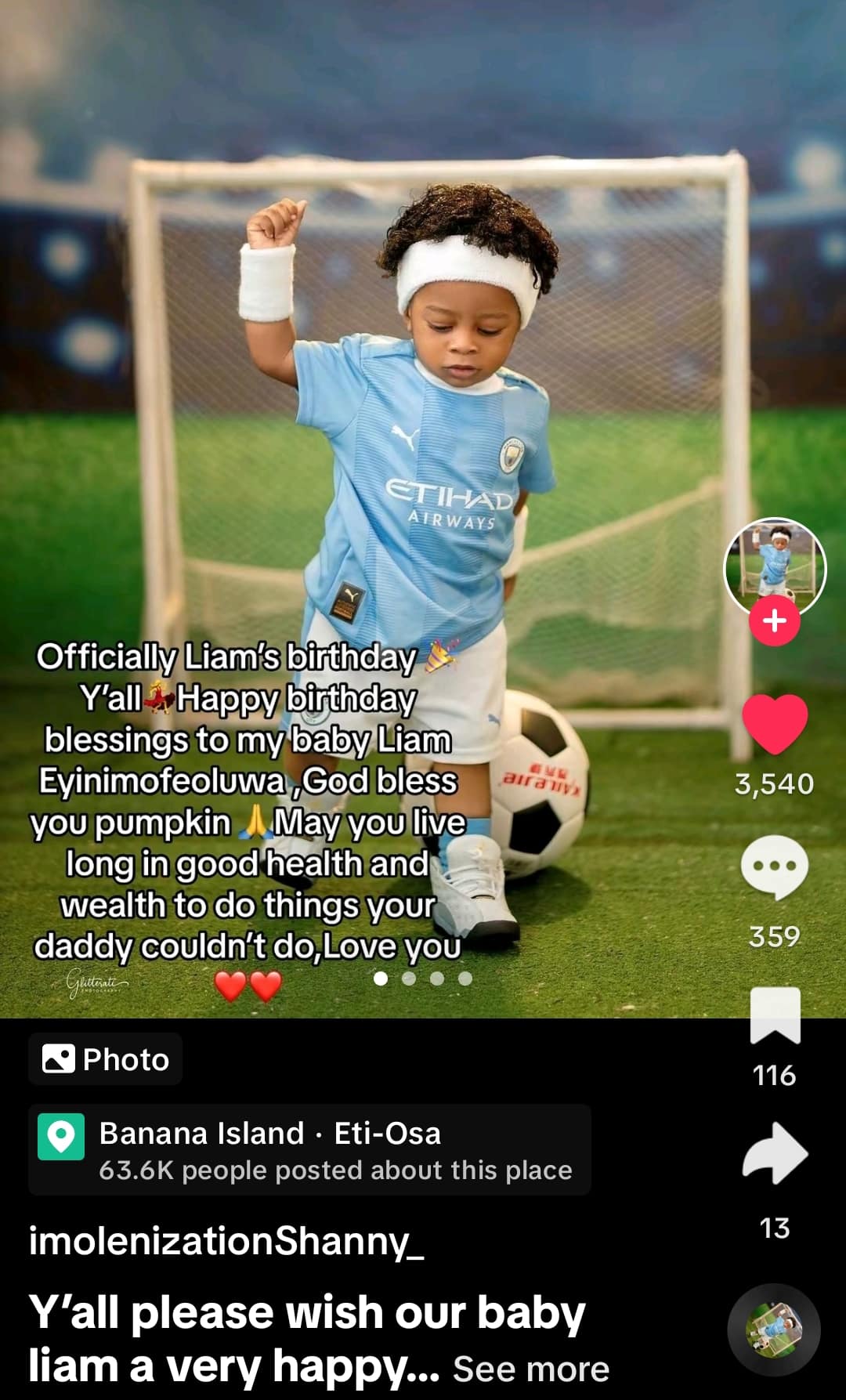 In the said post, the little boy who marks his first birthday today was dressed in a Manchester City jersey.