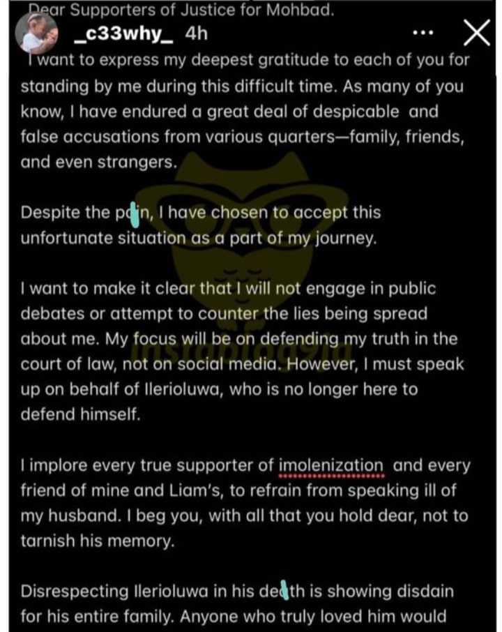 I want to make it clear that | will not engage in public debates or attempt to counter the lies being spread about me. My focus will be on defending my truth in the court of law, not on social media. However, I must speak up on behalf of Ilerioluwa, who is no longer here to defend himself.