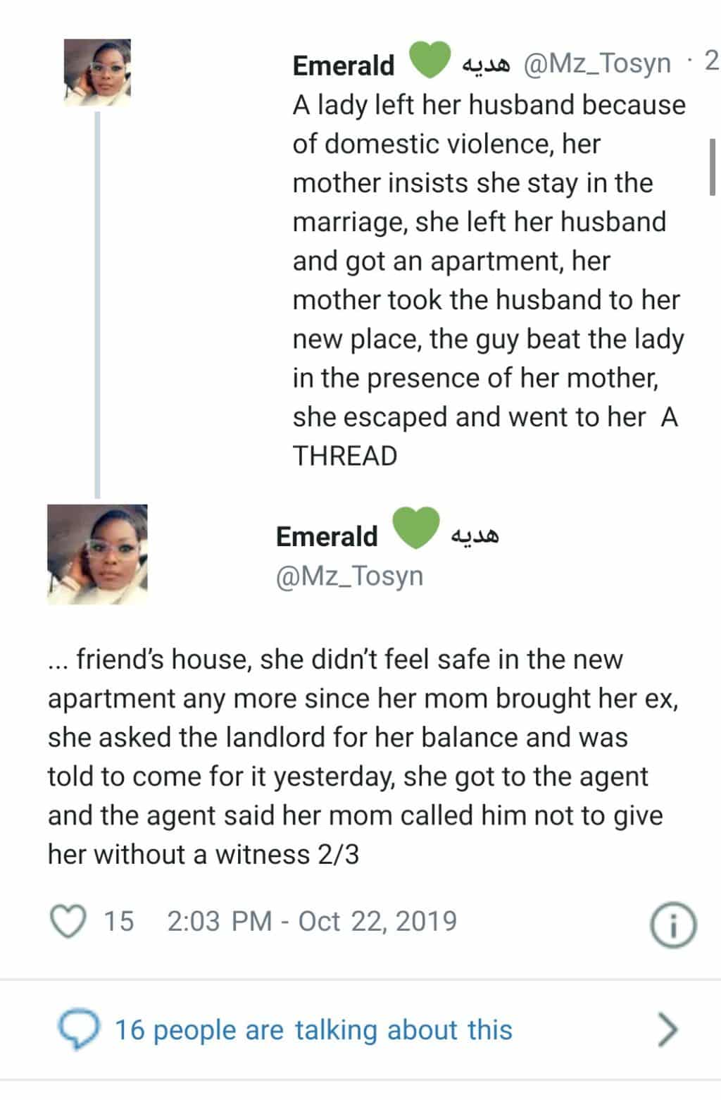 “A lady left her husband because of domestic violence, her mother insists she stay in the marriage, she left her husband and got an apartment, her mother took the husband to her new place, the guy beat the lady in the presence of her mother, she escaped and went to her friend’s house.