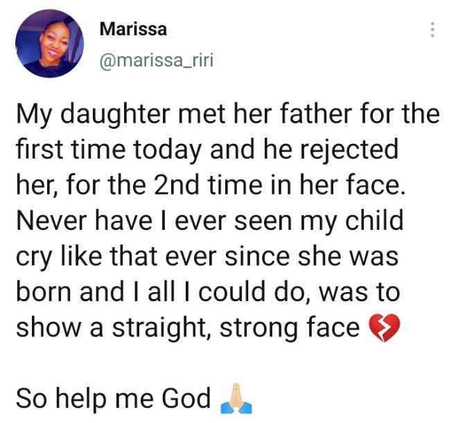 “My daughter met her father for the first time today and he rejected her, for the 2nd time in her face. Never have I ever seen my child cry like that ever since she was born and I all I could do, was to show a straight, strong face.