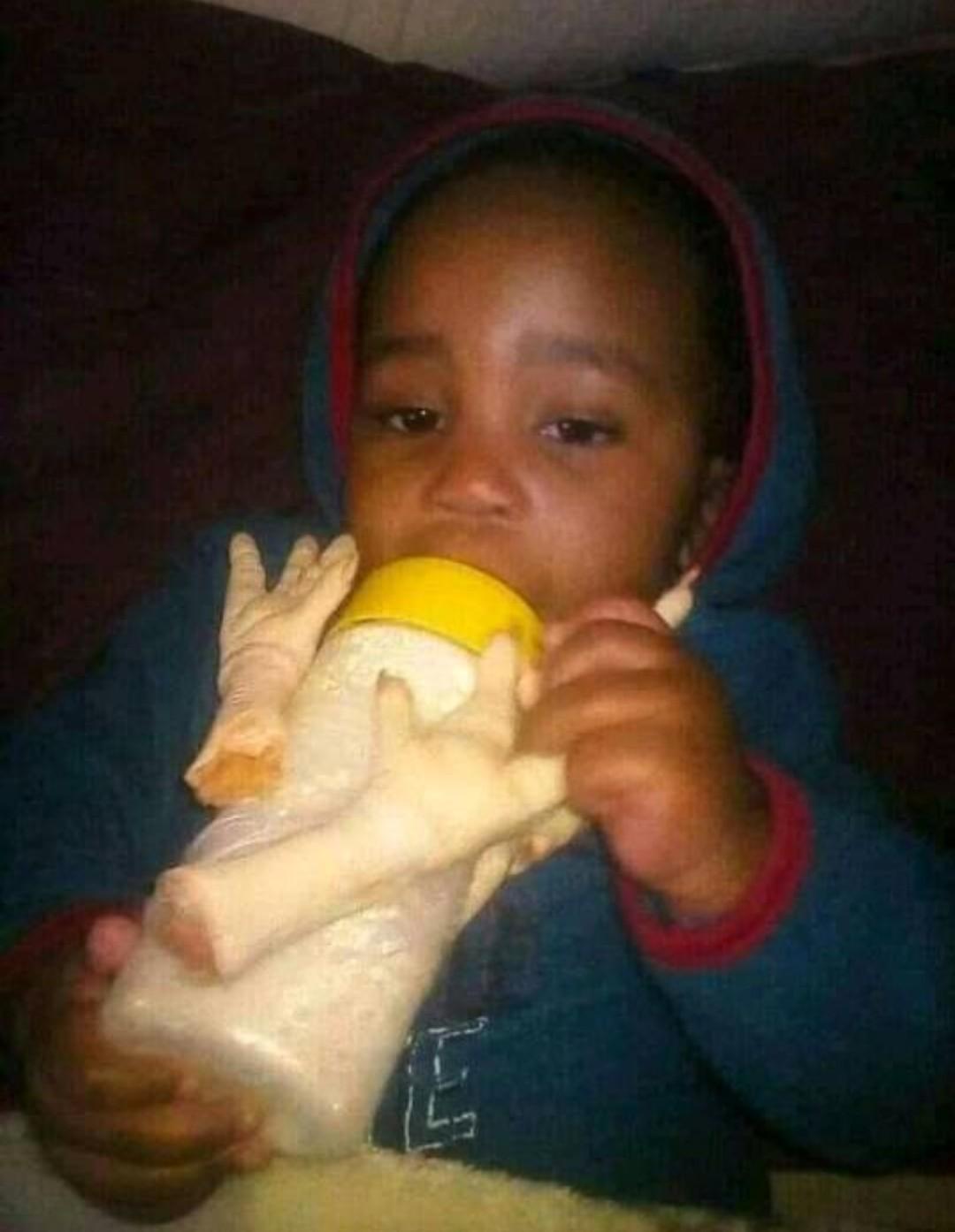 A Nigerian mother has shared hilarious photos of her little child who used chicken legs as handle while eating from a bottle.