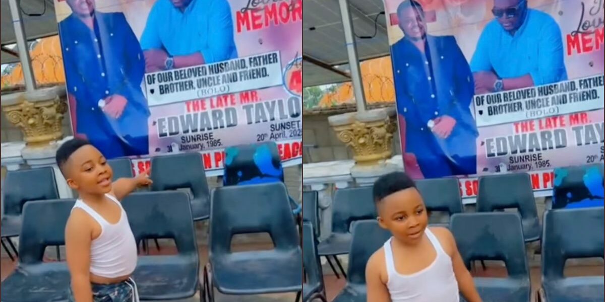 The clip, shared by user @mamachris917, has gone viral on TikTok, capturing the boy’s innocent joy as he points to the large funeral banner placed in their compound.