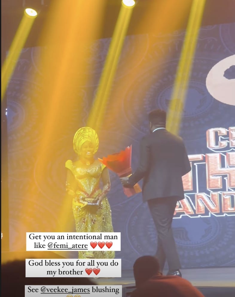 As Veekee took a brief pause from her hosting duties, Femi approached her with the bouquet, making for a touching display of affection that drew applause from attendees.