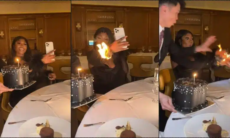 Young lady almost set a restaurant on fire after mistakenly lighting herself up while making a video of a birthday cake.