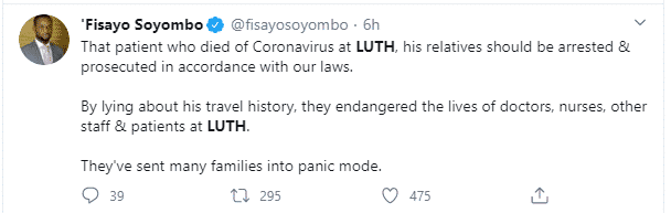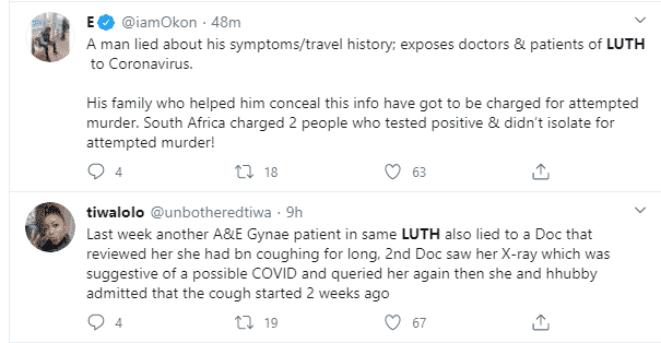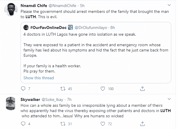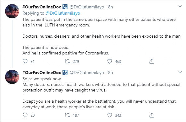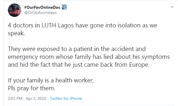 “4 doctors in LUTH Lagos have gone into isolation as we speak. They were exposed to a patient in the accident and emergency room whose family has lied about his symptoms and hid the fact that he just came back from Europe. If your family is a health worker, Pls pray for them.