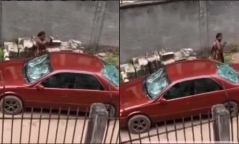 Moment Nigerian lady destroys husband’s car with stone (Video)