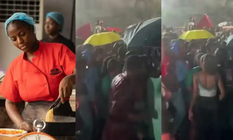 Enthusiastic Nigerians show support to viral chef Hilda Baci by standing in the rain to cheer her on as she breaks Guinness record for marathon cooking.