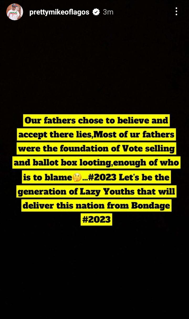 In what appears to be a way of taunting the country’s ruling All Progressives Congress (APC) political party, and recreating the controversial moment that spawned the allegation that the party paid impostors (fake bishops) to attend the unveiling of its Vice Presidential Candidate; Kashim Shettima, Pretty Mike appended a word of advice to Nigerians ahead of the forthcoming presidential elections in 2023.