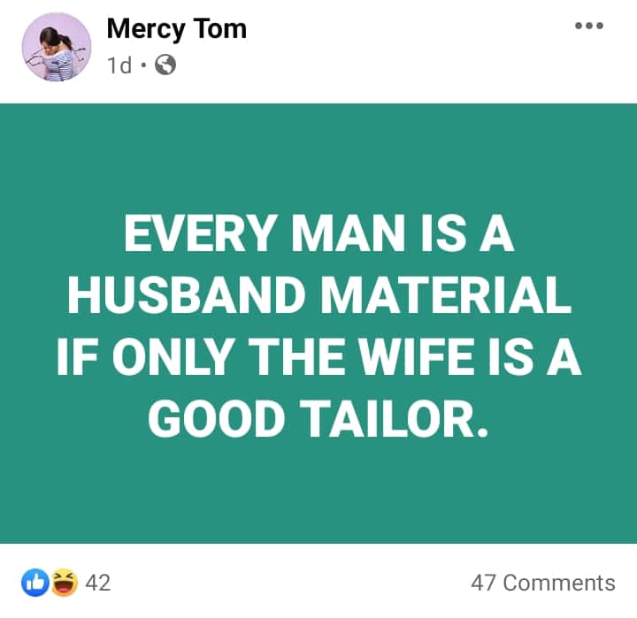 The lady who goes by the name, Mercy Tom, took to her social media page to make a case for men; lauding the male gender, she asserted that all men can be made into good husband if they have a good wife who shapes them into one
