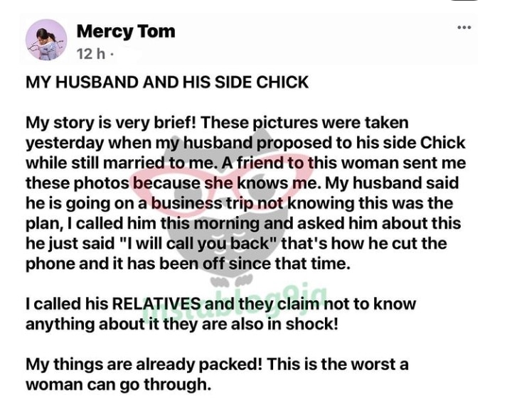 Moments after posting ‘every man is a husband material’, lady calls out her husband for proposing to side chick