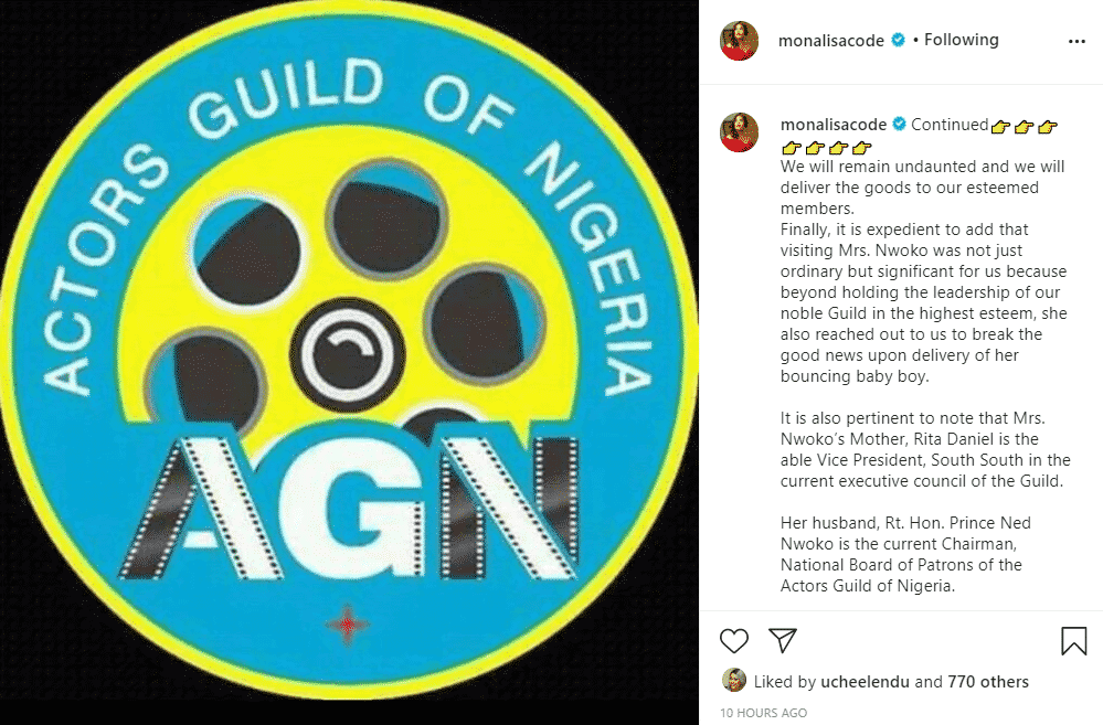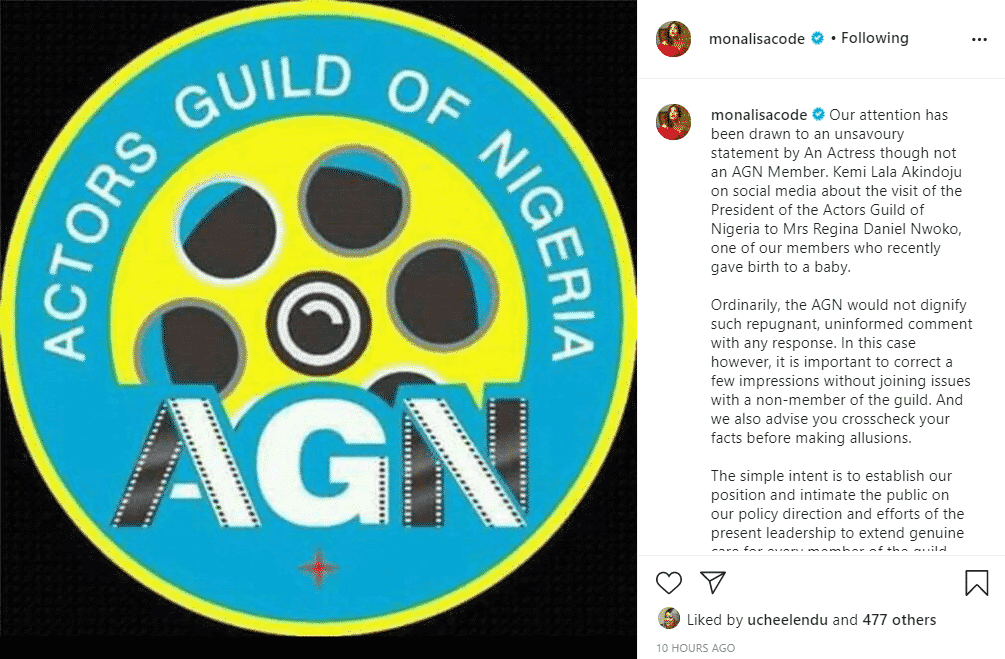 “Our attention has been drawn to an unsavoury statement by An Actress though not an AGN Member. Kemi Lala Akindoju on social media about the visit of the President of the Actors Guild of Nigeria to Mrs Regina Daniel Nwoko, one of our members who recently gave birth to a baby.