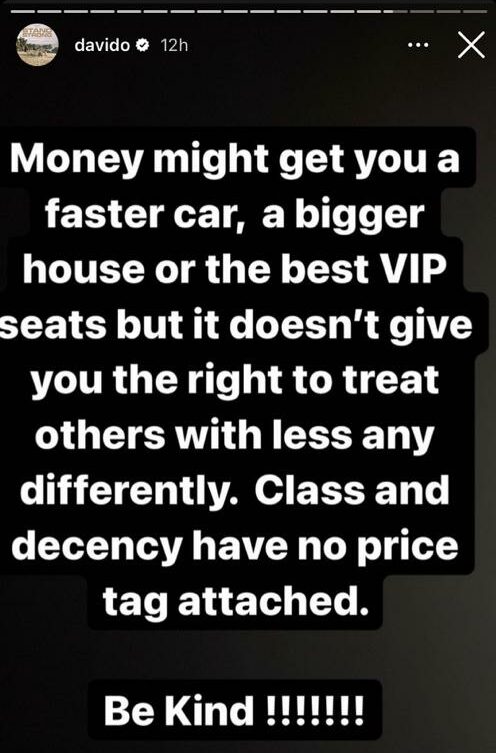 Taking to his Instagram story to pen the powerful note, Davido, hinted at the cost of decency and class.