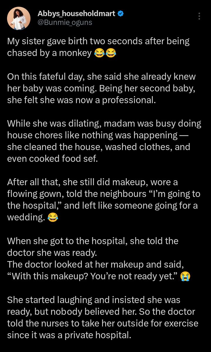 A woman has shared a dramatic and humorous account of how her sister gave birth moments after being chased by a monkey at a private hospital.
