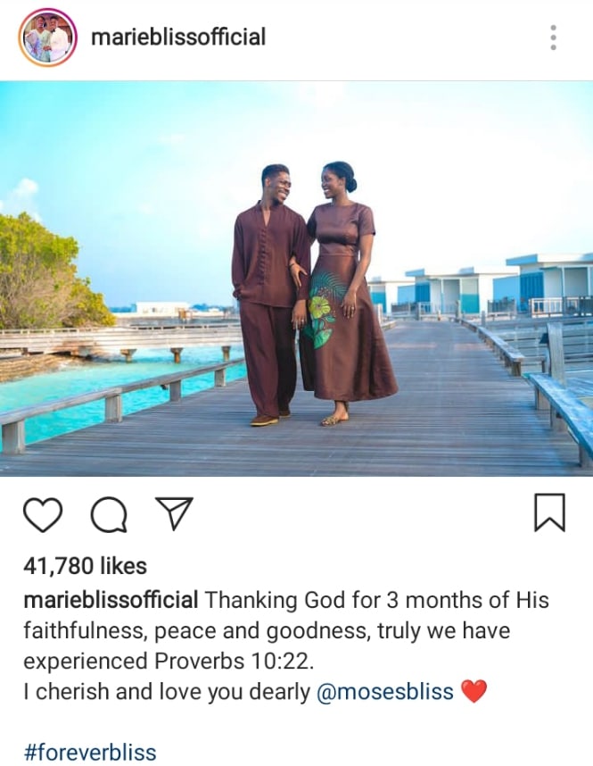 His words: “Thanking God for 3 months of His faithfulness, peace and goodness, truly we have experienced Proverbs 10:22. I cherish and love you dearly @mosesbliss ❤️ #foreverbliss.”