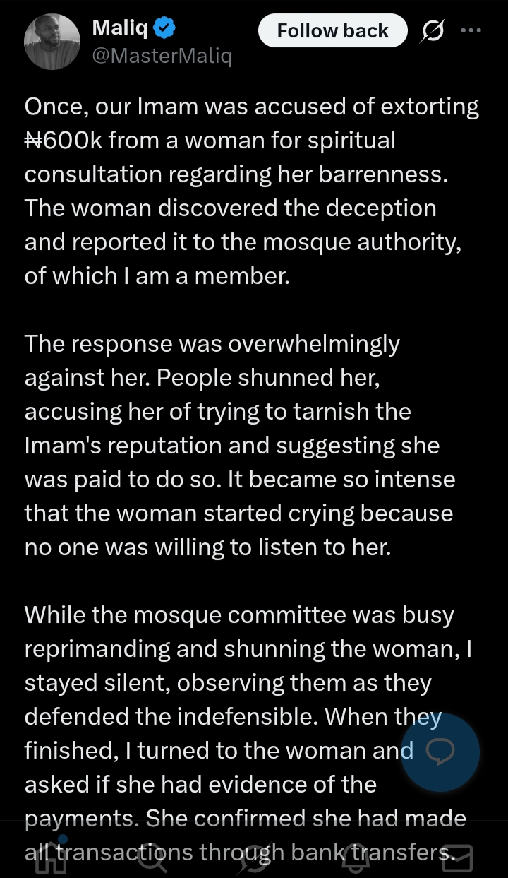 “Once, our Imam was accused of extorting ₦600k from a woman for spiritual consultation regarding her barrenness. The woman discovered the deception and reported it to the mosque authority, of which I am a member.