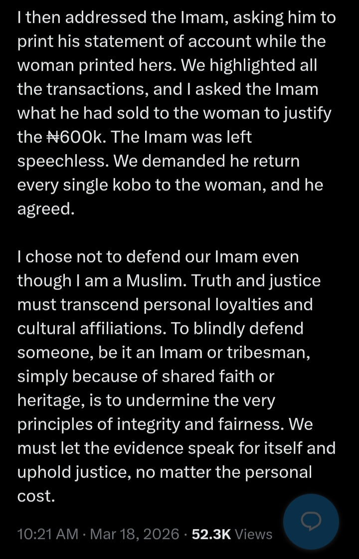 I then addressed the Imam, asking him to print his statement of account while the woman printed hers. We highlighted all the transactions, and I asked the Imam what he had sold to the woman to justify the ₦600k. The Imam was left speechless. We demanded he return every single kobo to the woman, and he agreed.