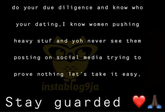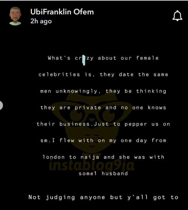 “What’s crazy about our female celebrities is they date the same men unknowingly. I flew with one day from London to Nigeria, and she was with someone’s husband. Not judging anyone, but y’all got to do your due diligence and know who you are dating.