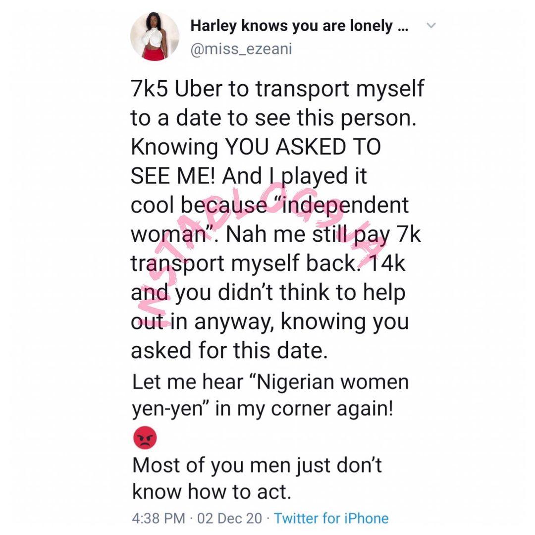 “Most men don’t know how to act,” – Lady laments after her date did nothing about her ₦14,500 transport fare