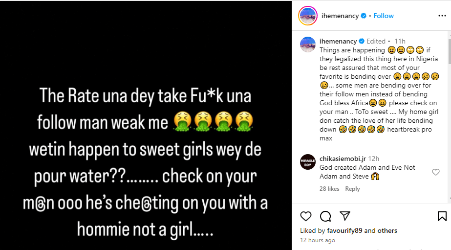 Additionally, Iheme Nancy averred that if LGBTQ activities get legalized in Nigeria, many people’s faves would be involved in this.