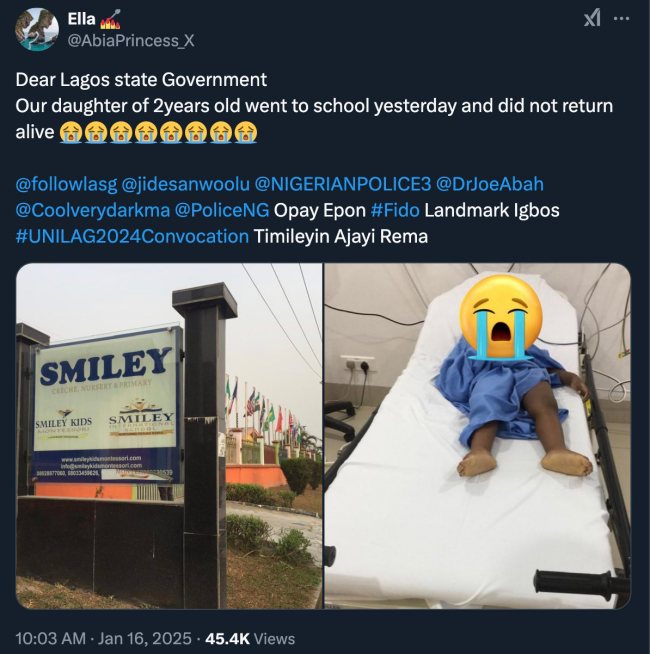 “Dear Lagos State Government, our daughter of 2 years old went to school yesterday and did not return alive 😭😭😭. How do you have a pool in school premises without proper monitoring?😭