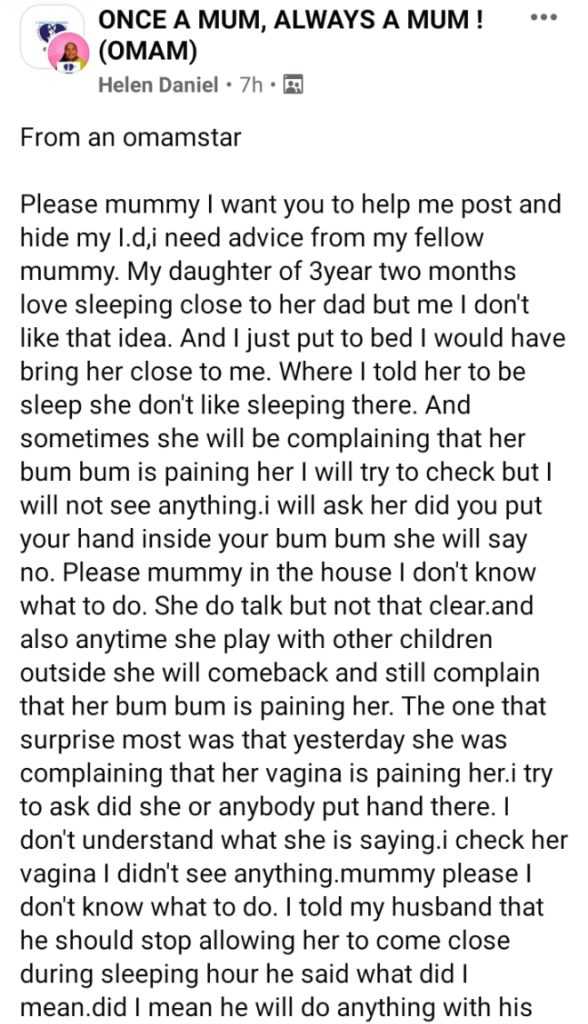 The concerned mother who shared her story to Facebook group, “Once a mum, always a mum”, revealed that her daughter stays on the same bed with her father and she has her suspicions.